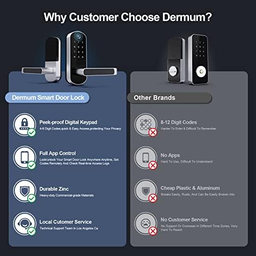 Introducing the Dermum Smart Lock, revolutionizing the way you secure and access your front door. Say goodbye to fumbling with keys or worrying about lost or stolen copies. This state-of-the-art keyless entry door lock provides ultimate convenience, security, and style for your home.
